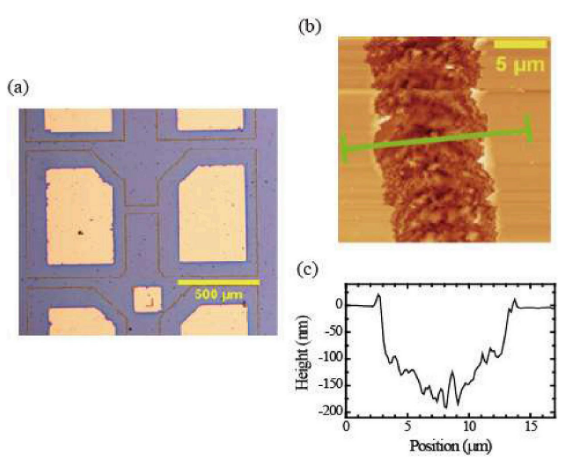 レーザー加工で作った CVD グラフェン デバイスと原子間力顕微鏡(AFM)で観測した断面図